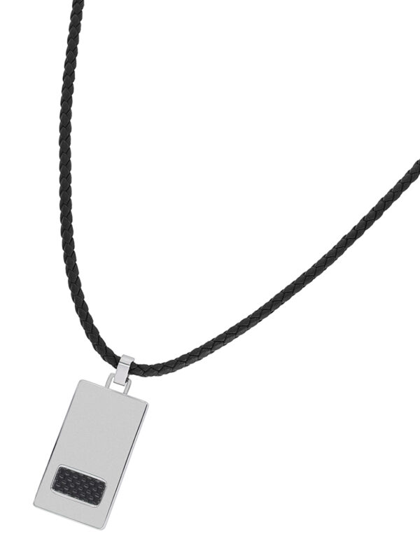 Collar de piel trenzada en color negro, con placa rectangular de acero y detalle en fibra de carbono.