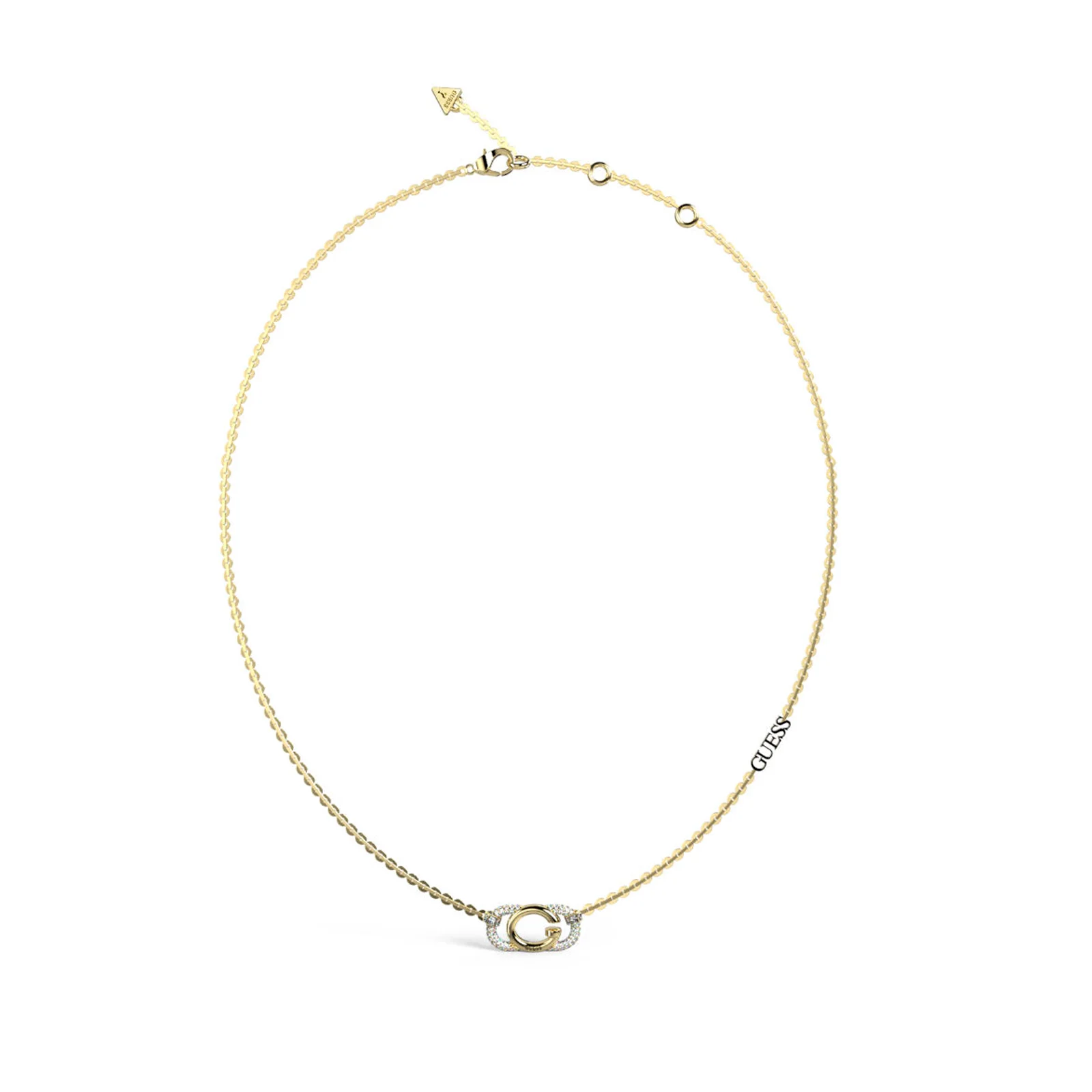 Collar Guess Acero Oh My G JUBN04509JWYGT-U: Gargantilla fabricada en acero inoxidable con baño dorado IP, en acabado pulido. Colgante con una letra G dorada y dos semicírculos decorados con circonitas en talla brillante transparentes. Logo calado en uno de los laterales de la cadena de eslabones, con anillas para regular la longitud y cierre tipo mosquetón.