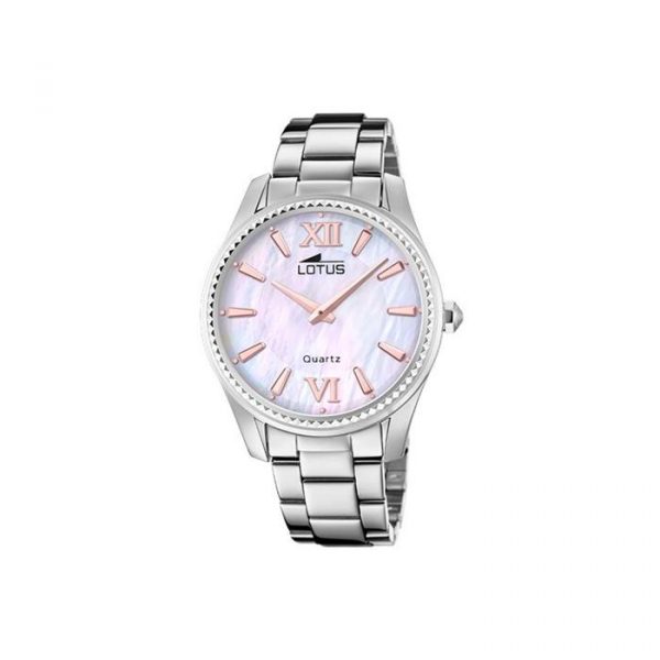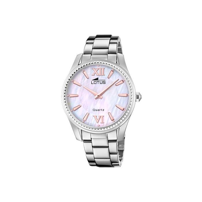 Reloj Lotus para mujer de la colección Bliss fabricado en acero inoxidable plateado. Estamos ante un elegante reloj de diseño femenino compuesto por caja de 38mm de diámetro con esfera en nácar beige que contiene indicadores y agujas en rosado movidas por mecanismo Japonés de cuarzo analógico protegido por cristal mineral. Su brazalete lo forman eslabones plateados con cierre desplegable. Resistente al agua hasta 5 ATM.