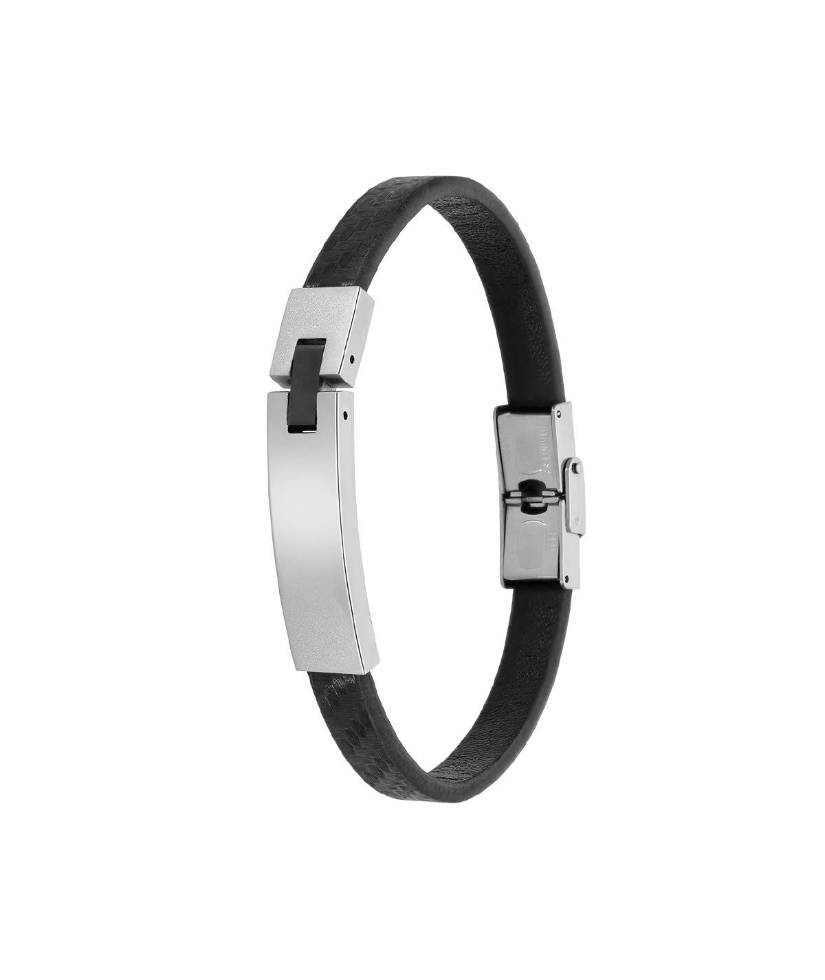 Una pulsera de hombre, combinada en acero y piel, con pulsera de piel negra y placa lisa personalizable dónde podrás grabar un nombre, palabra o fecha significativa para vosotros. El cierre es de acero pudiendo ajustarse a la medida deseada