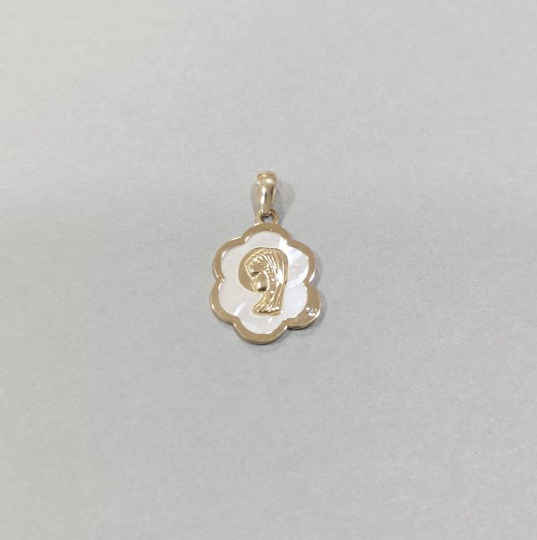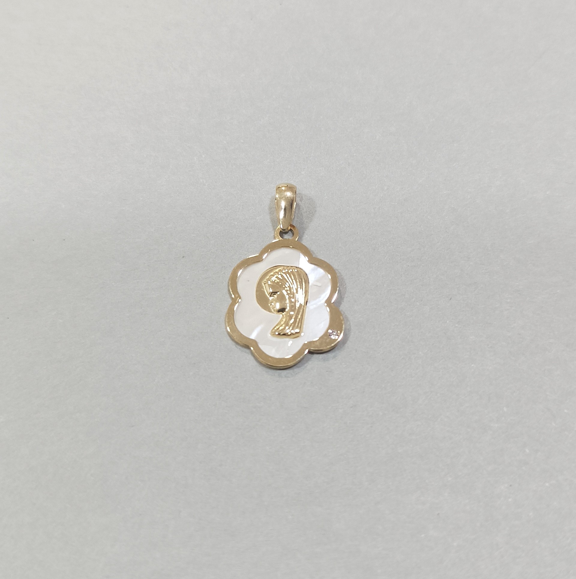 MEDALLA DE ORO AMARILLO DE 18 KILATES Y NACAR Y UNA ZIRCONITA.