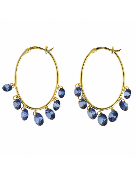 Fabricados en plata con baño de Oro de ley 925 mls. Pendientes de Aro Ovalados con siete circonitas azul “zafiro” colgando. Cierre italiano.