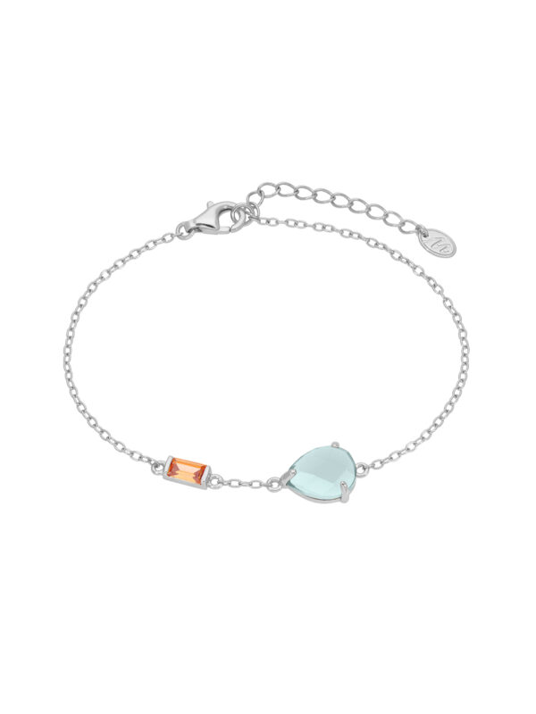 Pulsera Sienna. Plata de 1ª Ley rodiada. Cristal talla lágrima color turquesa claro, cristal baguette champagne y circonita. Cierre mosquetón. Cadena adaptable.