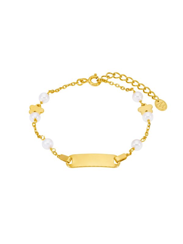 Pulsera de plata de 1ª Ley con baño den oro de 18k. Lleva una plaquita grabable, y la cadena esta adornada con perlas y un motivo en forma de flor. Cierre reasa. Cadena adaptable.